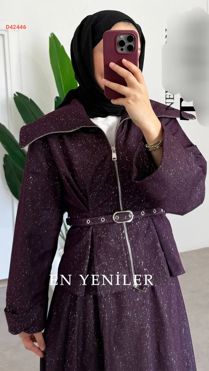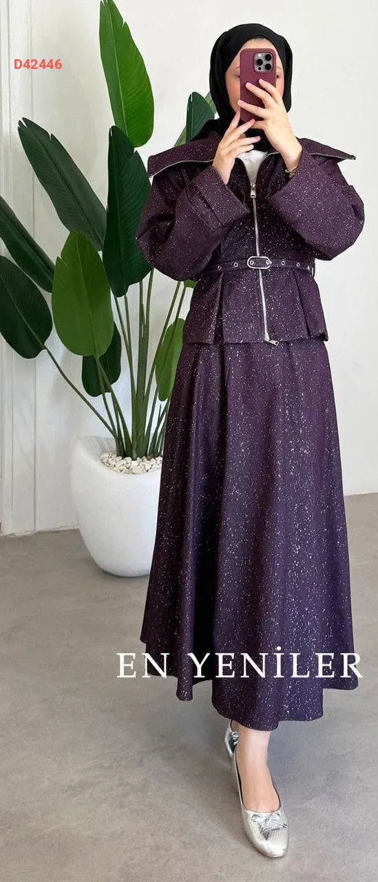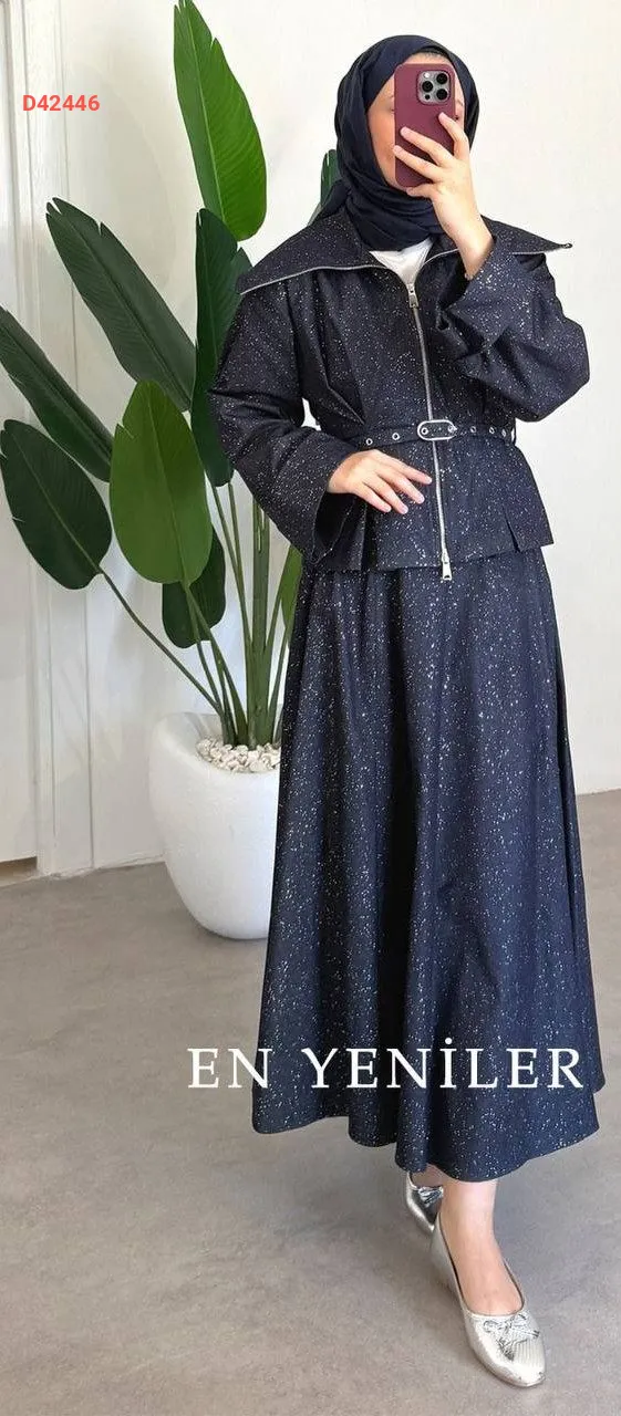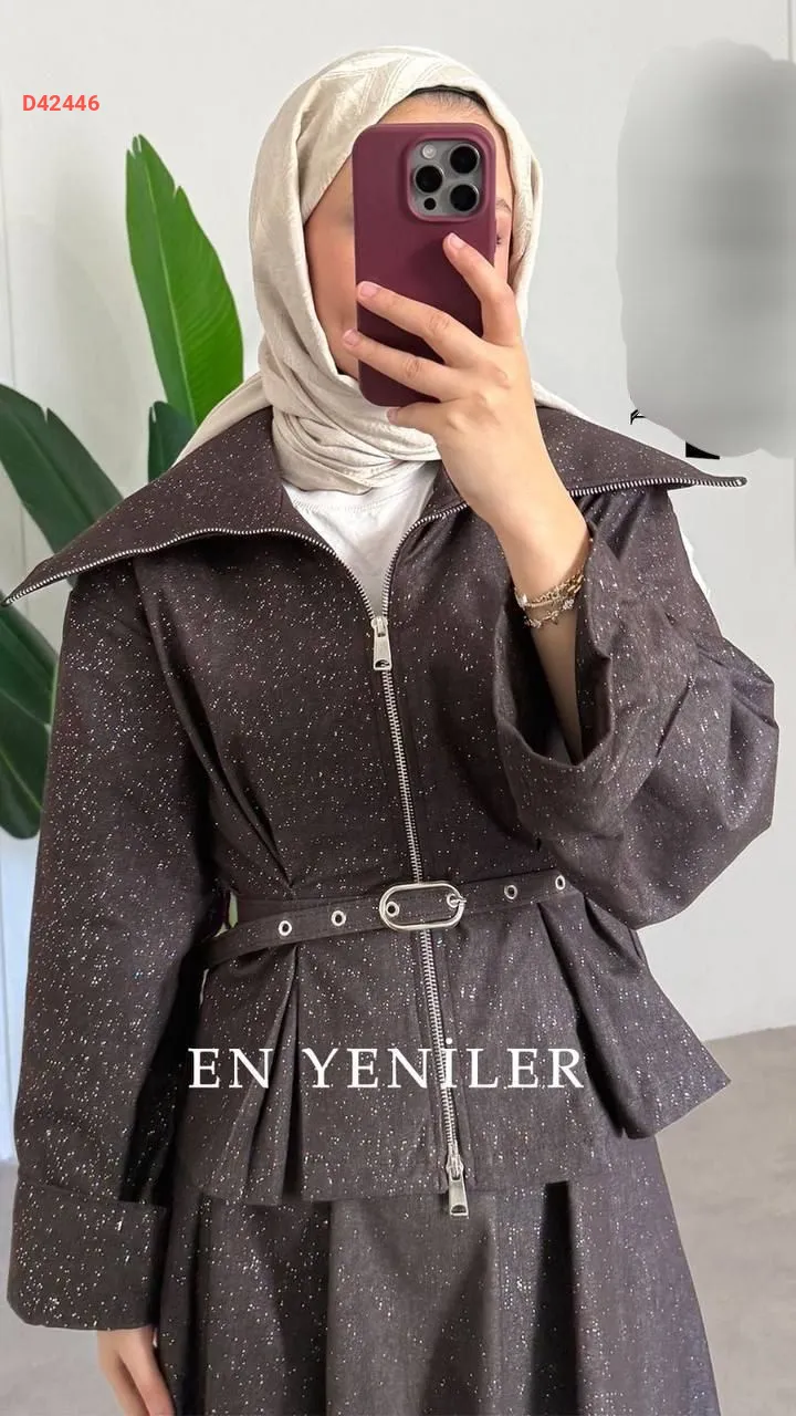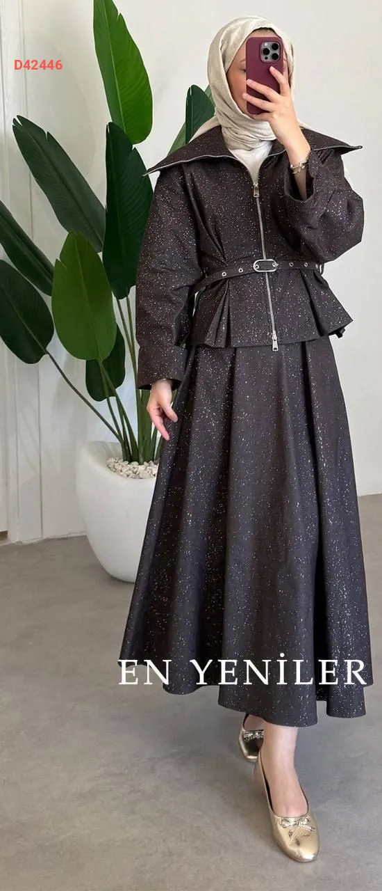 طقم تنورة قطعتين لامع ، بسحاب، مع حزام