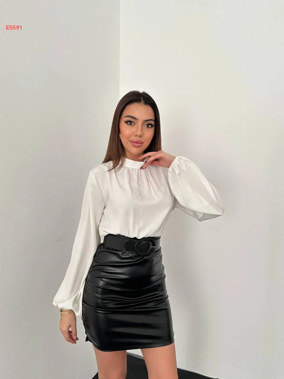فستان قصير جلد بتفاصيل تنورة وبلوزة