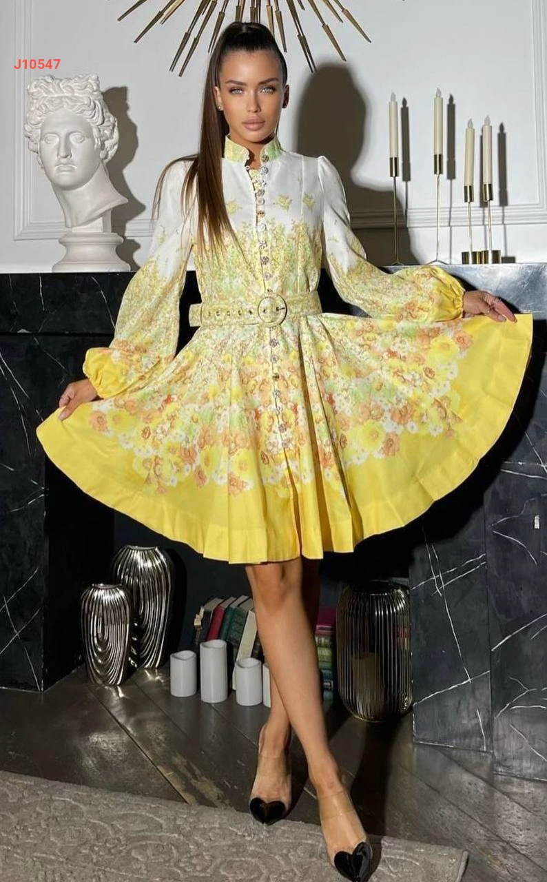 فستان قصير منقوش بأزرار اكسسوار