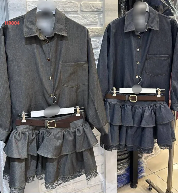 طقم تنورة قصير كشكش مع دانتيل