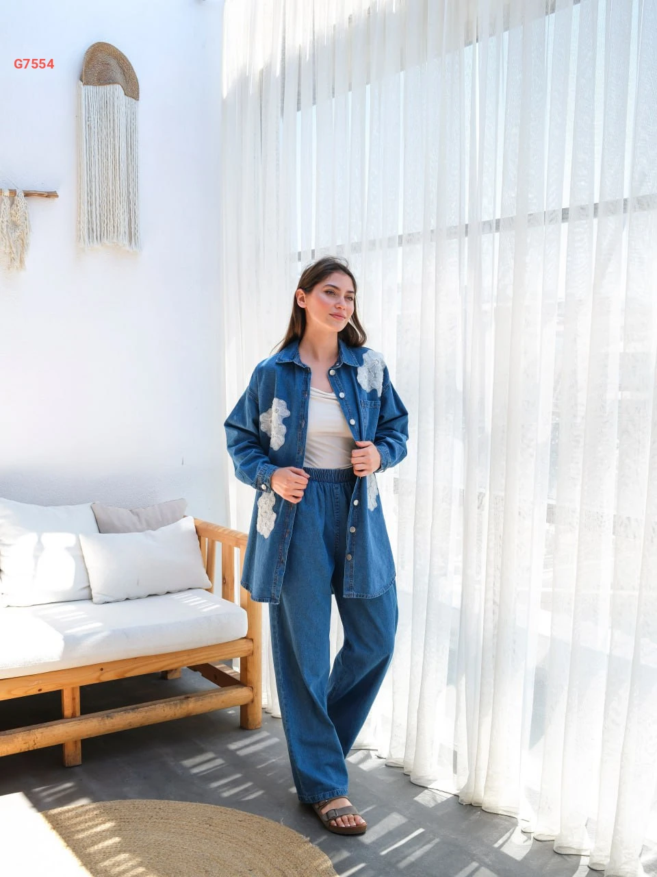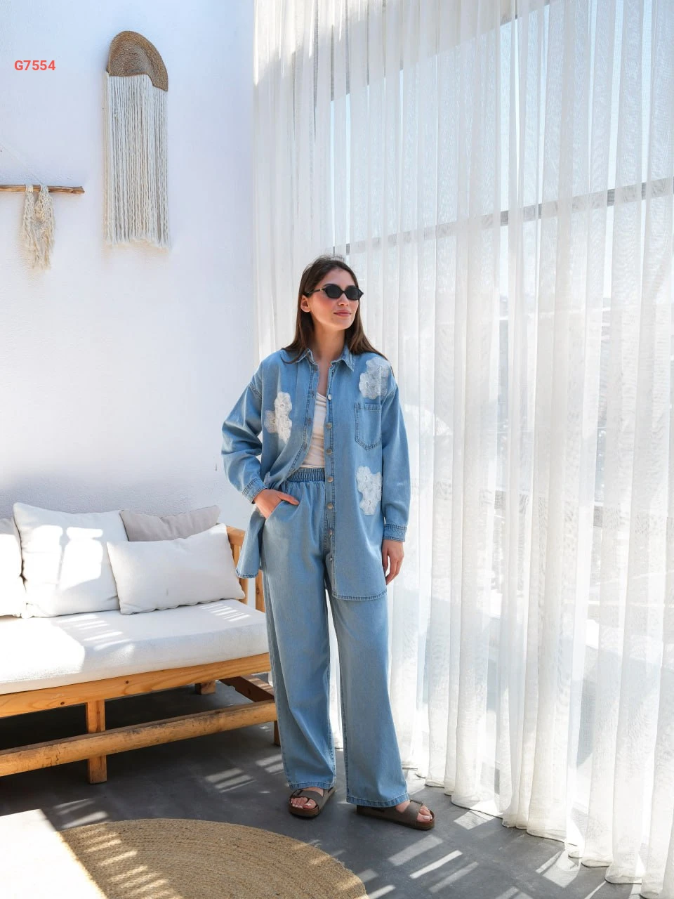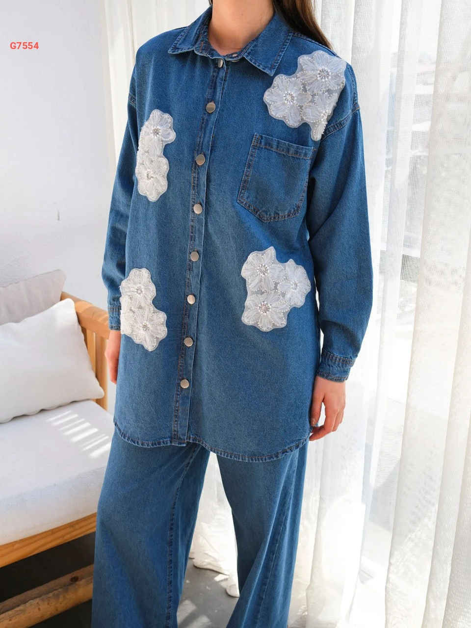 طقم بنطال جينز قطعتين بأزرار مزين بعرق ورد أبيض