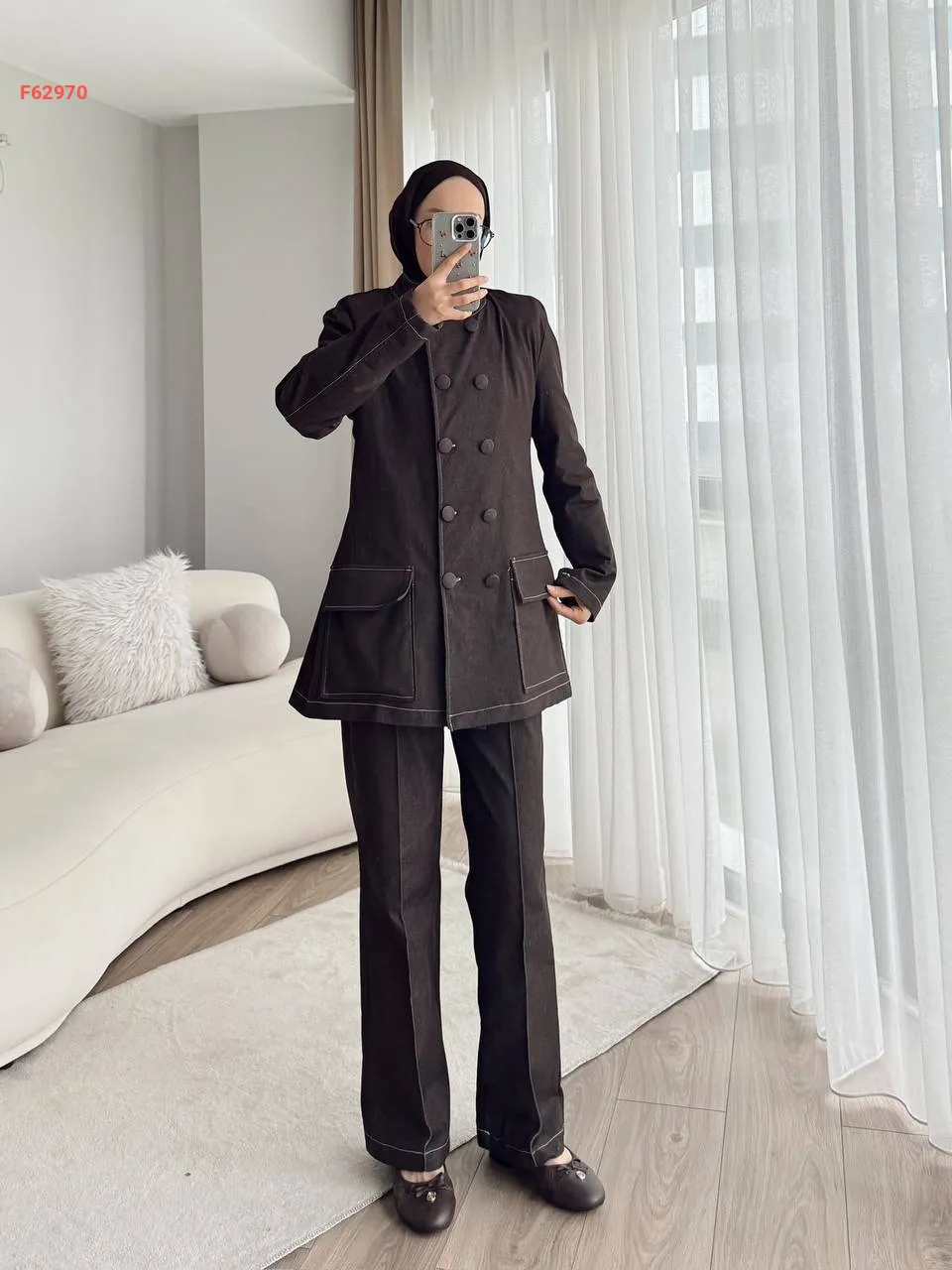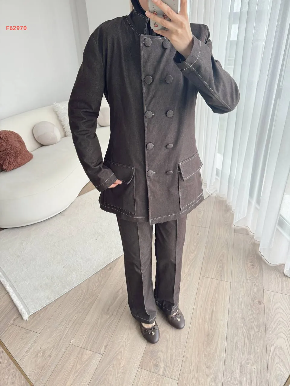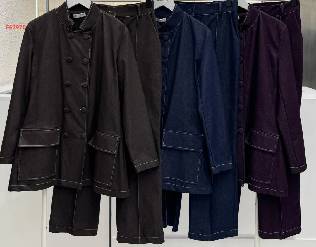 طقم جينز قطعتين بأزرار مزدوجة بياقة مرتفعة مع جيب عريضة