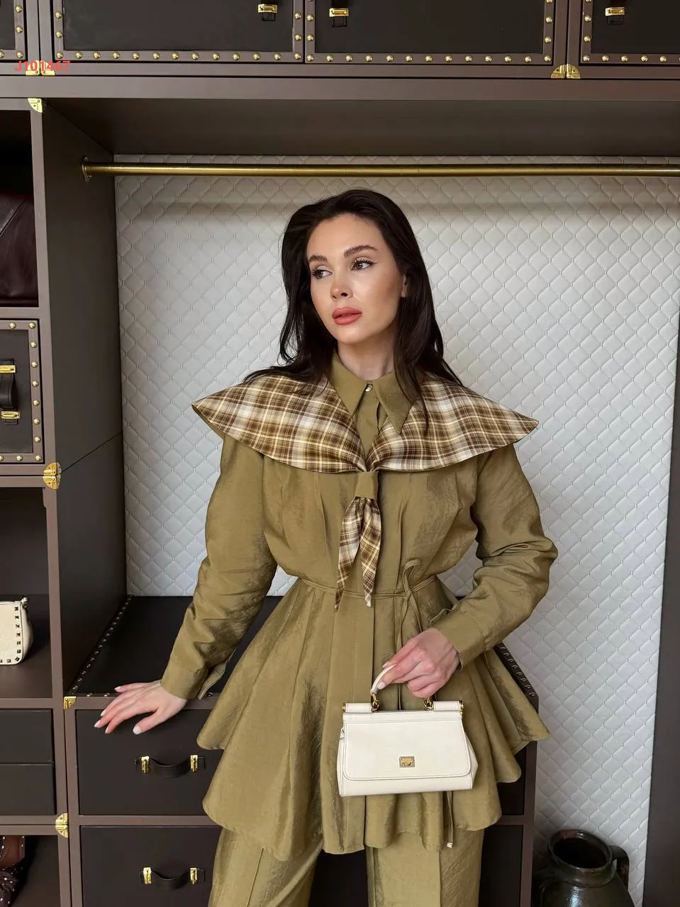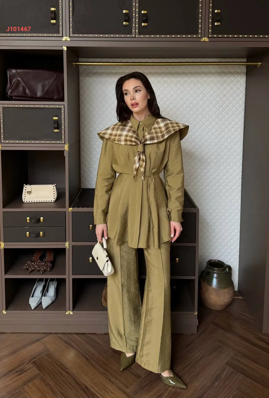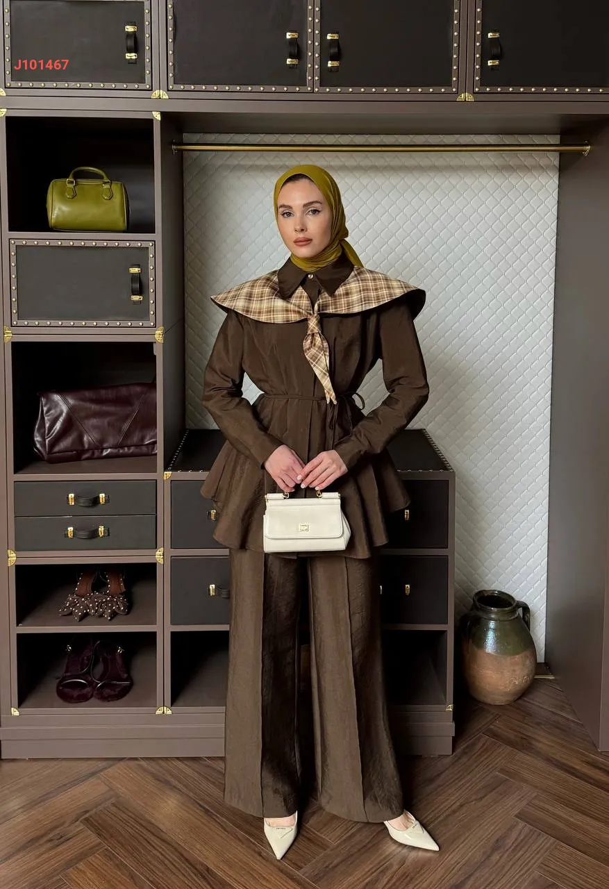 طقم بنطال قطعتين بأزرار مخفية مع فولار، مع ربطة خصر