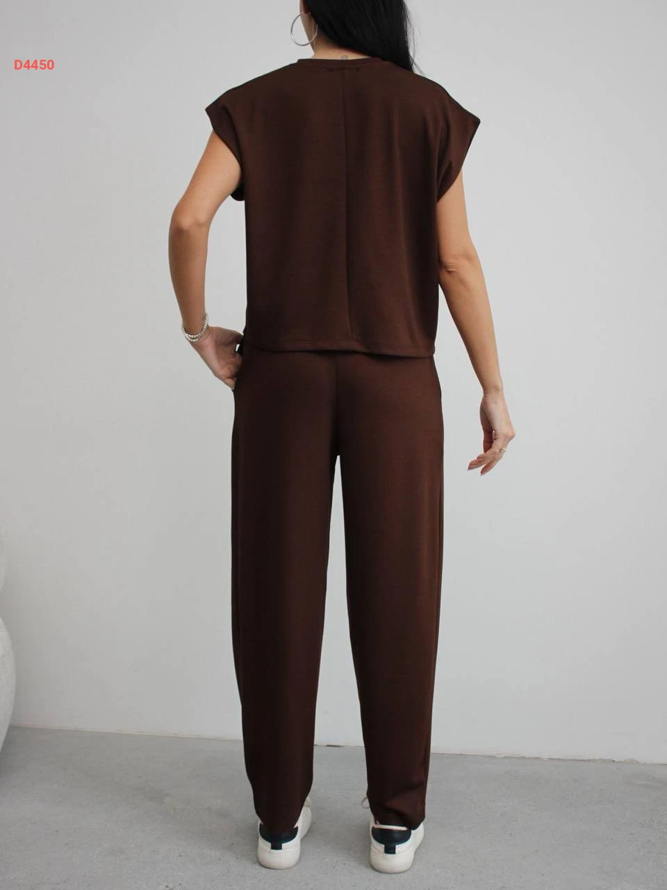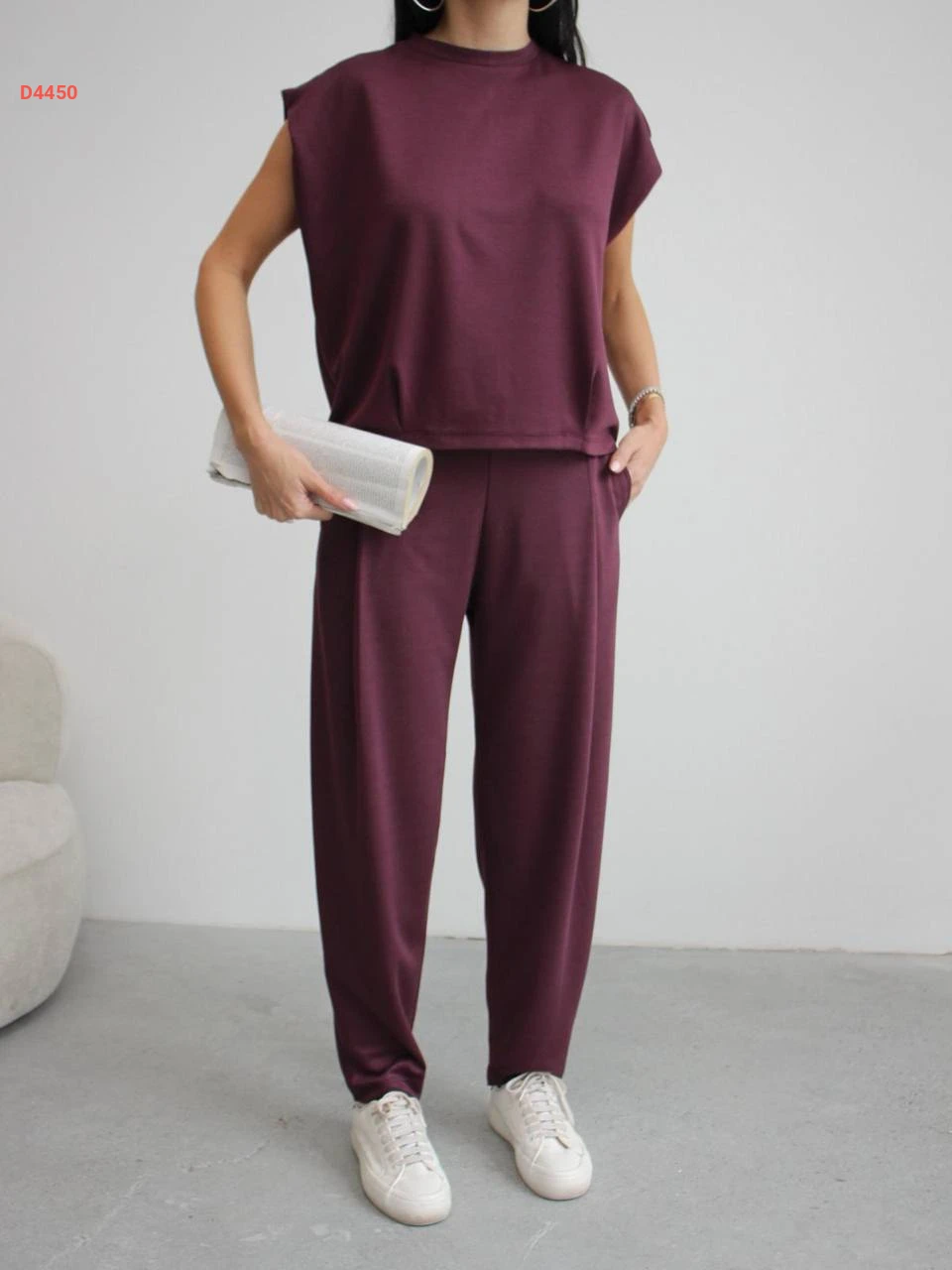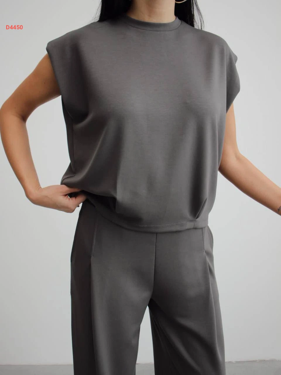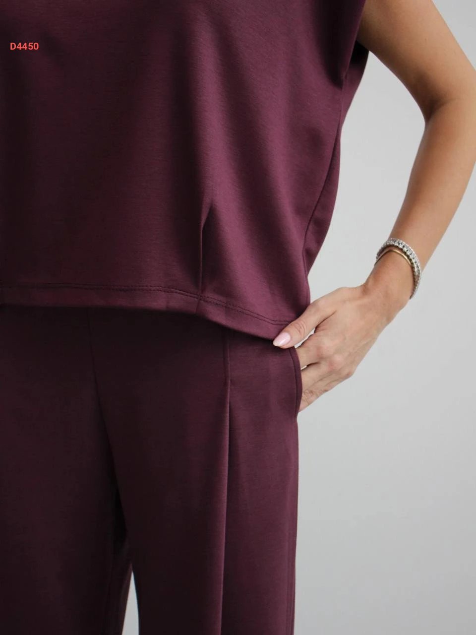 طقم بنطال قطعتين حفر سادة مع جيب بياقة دائرية