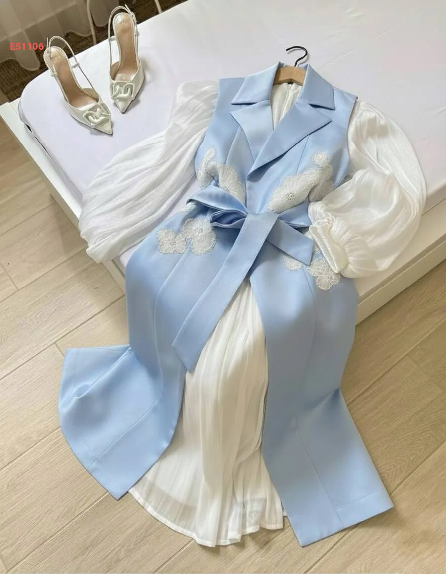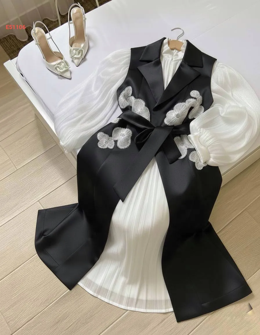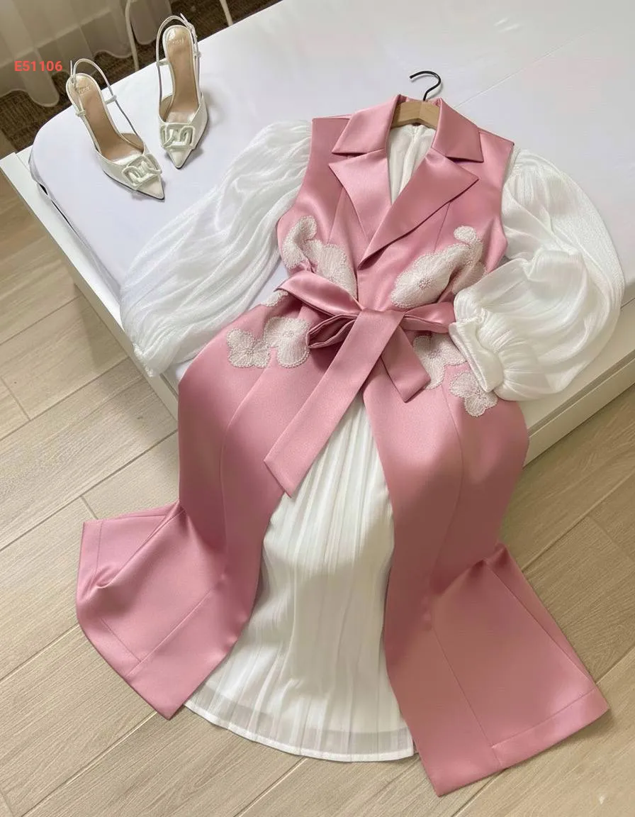 طقم قطعتين فستان كلوش مع جاكيت ساتان ، تطريز بالورود