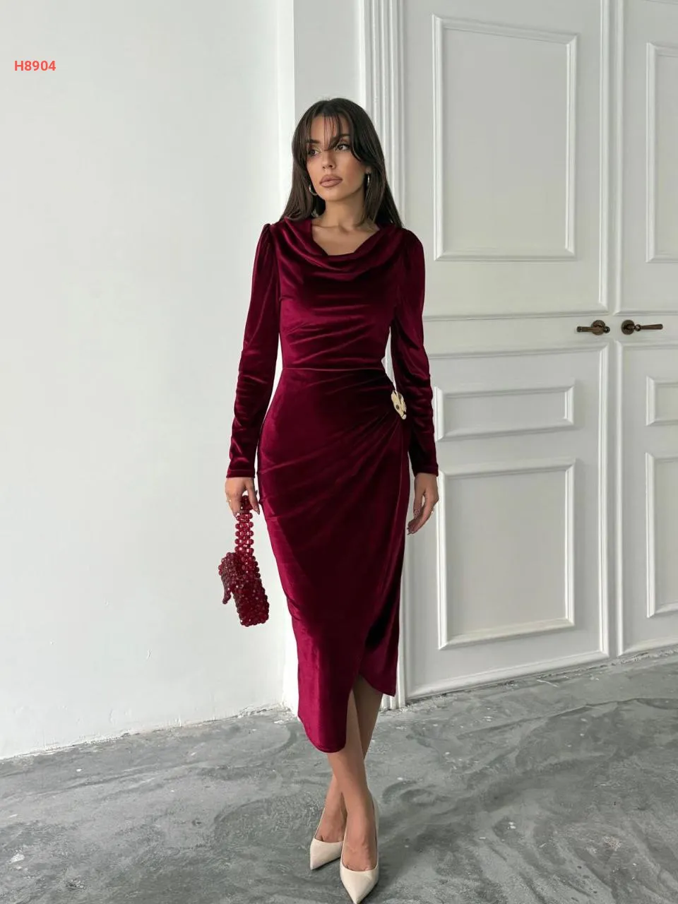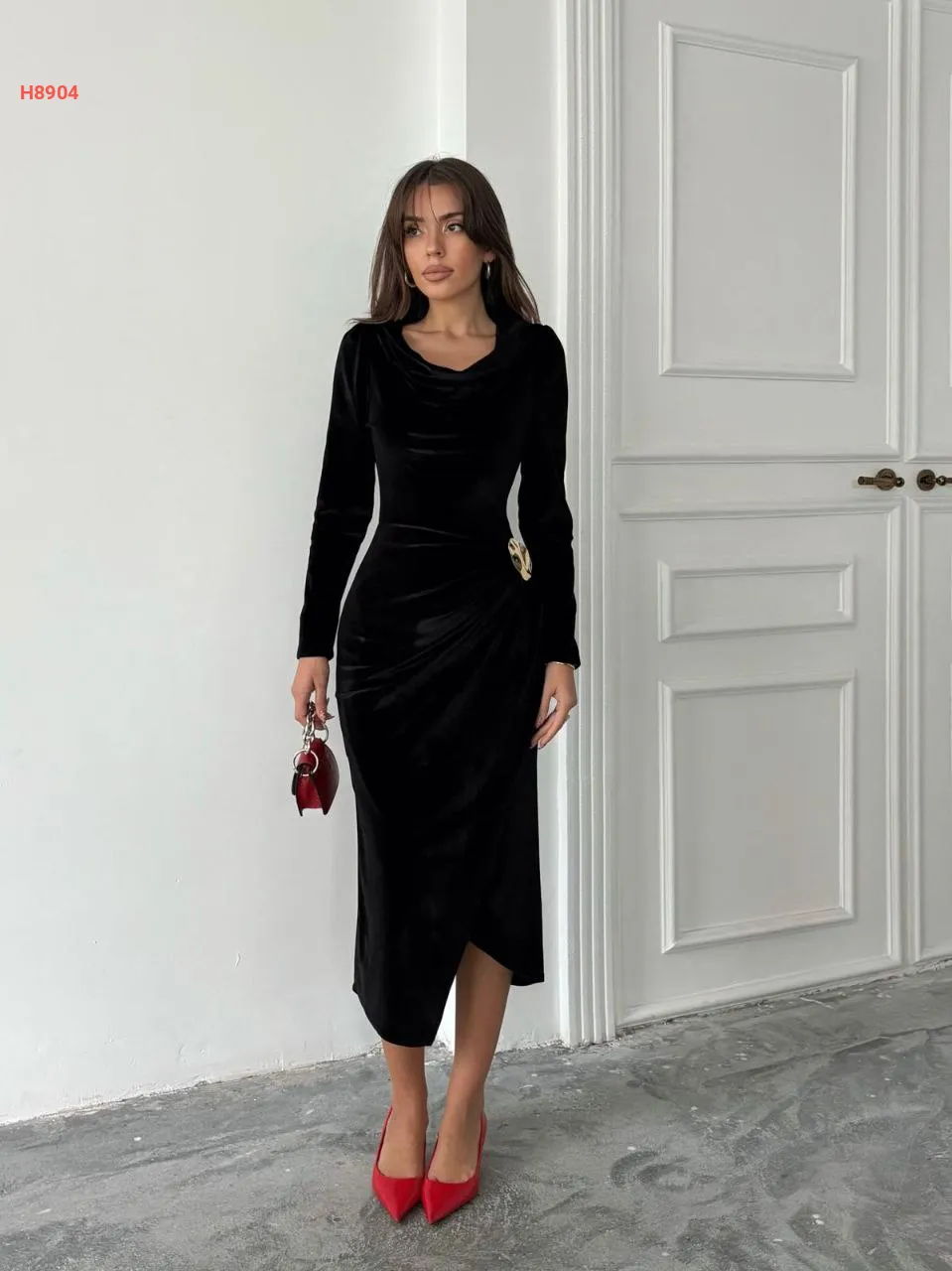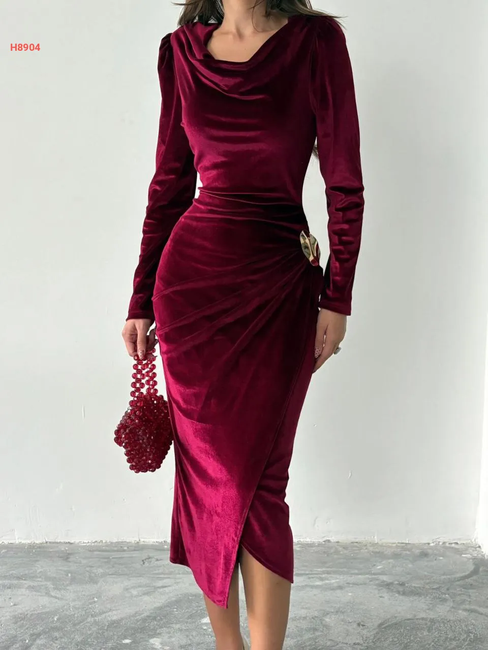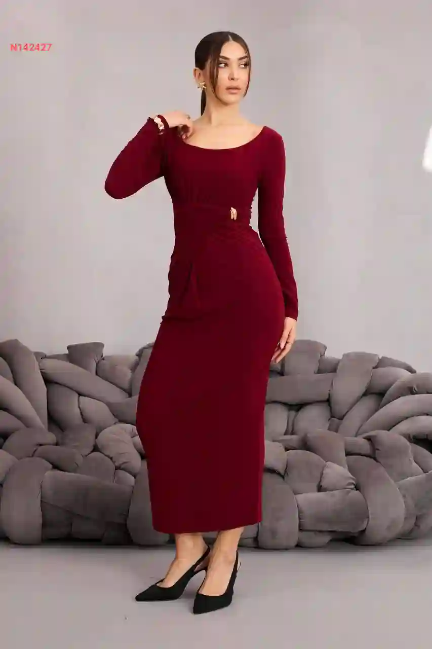 فستان مخمل مجمع بإبزيم دهبي جانبي